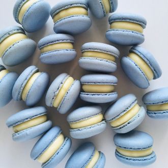 Миндальные крышечки, ганаш на белом шоколаде, ароматизированный натуральной горной лавандой, конфи черника.