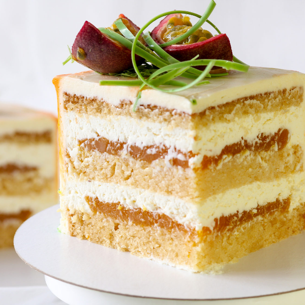 Сочный бисквит с цедрой апельсина, пропитанный апельсиновым сиропом, сливочно-сырный крем с белым шоколадом и кули манго-маракуйя.