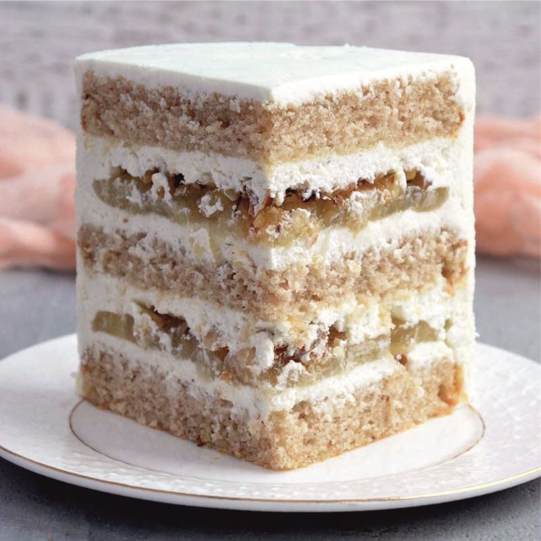 Сливочный бисквит, пропитанный грушевым сиропом, сливочно-сырный крем с горгонзолой, конфи с кусочками груши и обжареный грецкий орех.