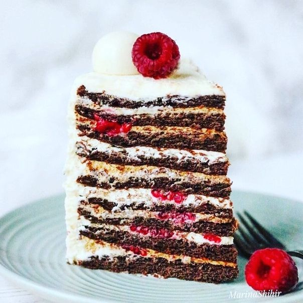 Шоколадный медовик, пропитанный сметанным кремом с малиной.