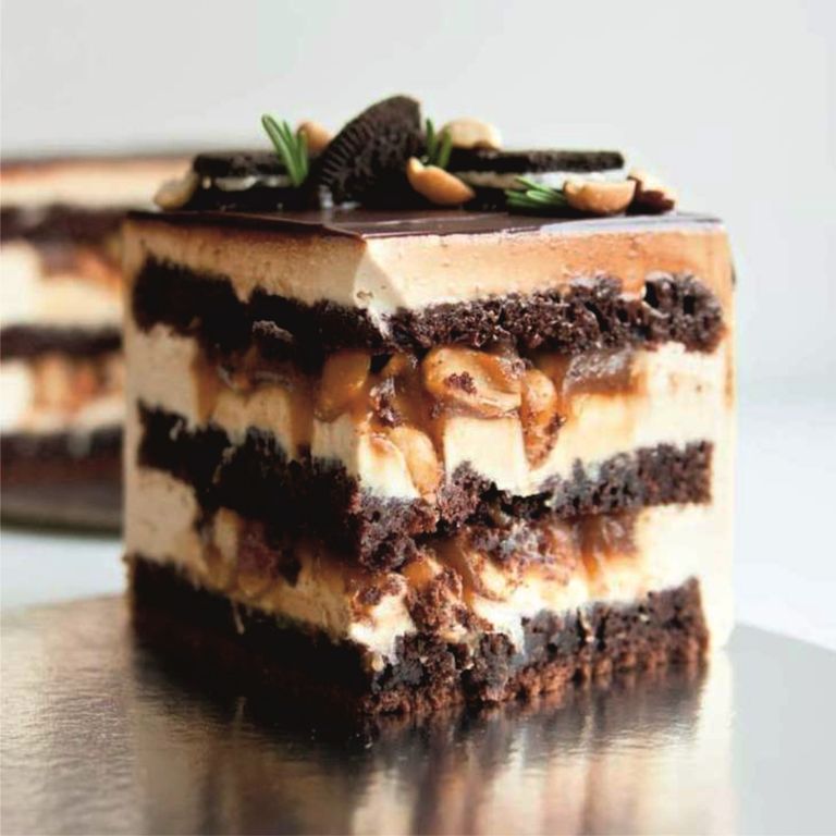 Шоколадные коржи брауни, крем-чиз с арахисовой пастой, солёная карамель с обжаренным арахисом, ганаш из молочного шоколада.